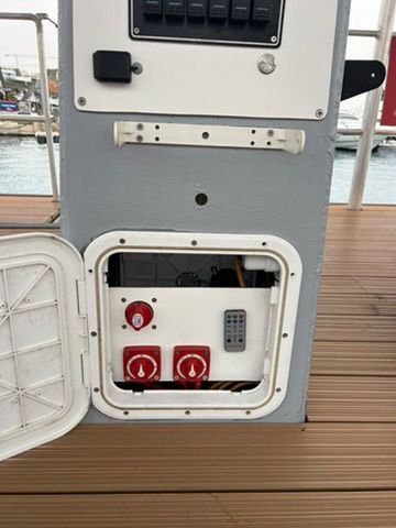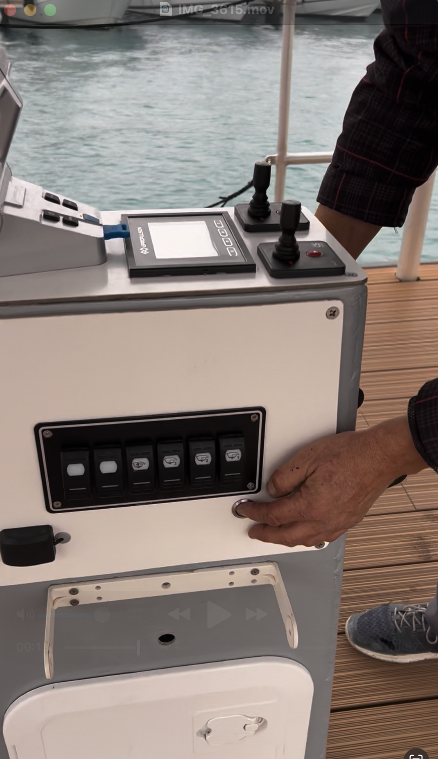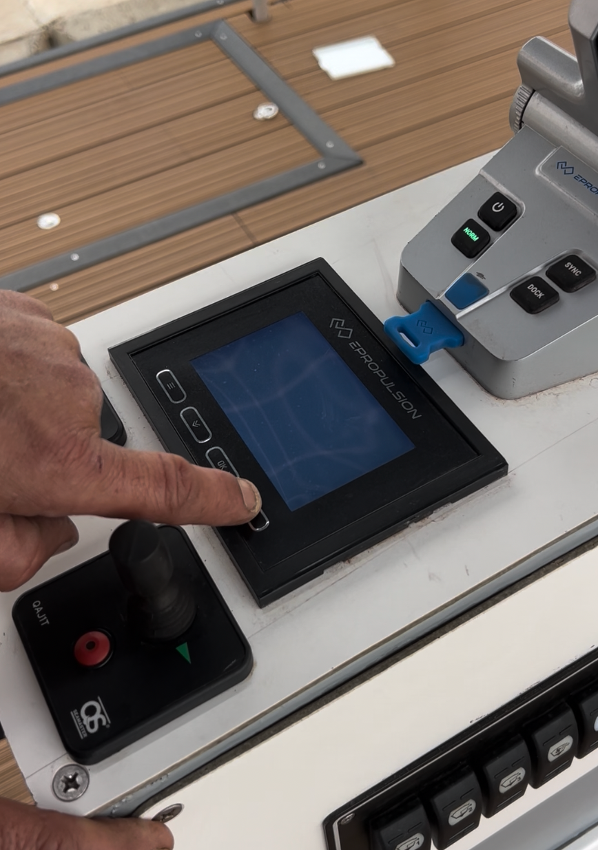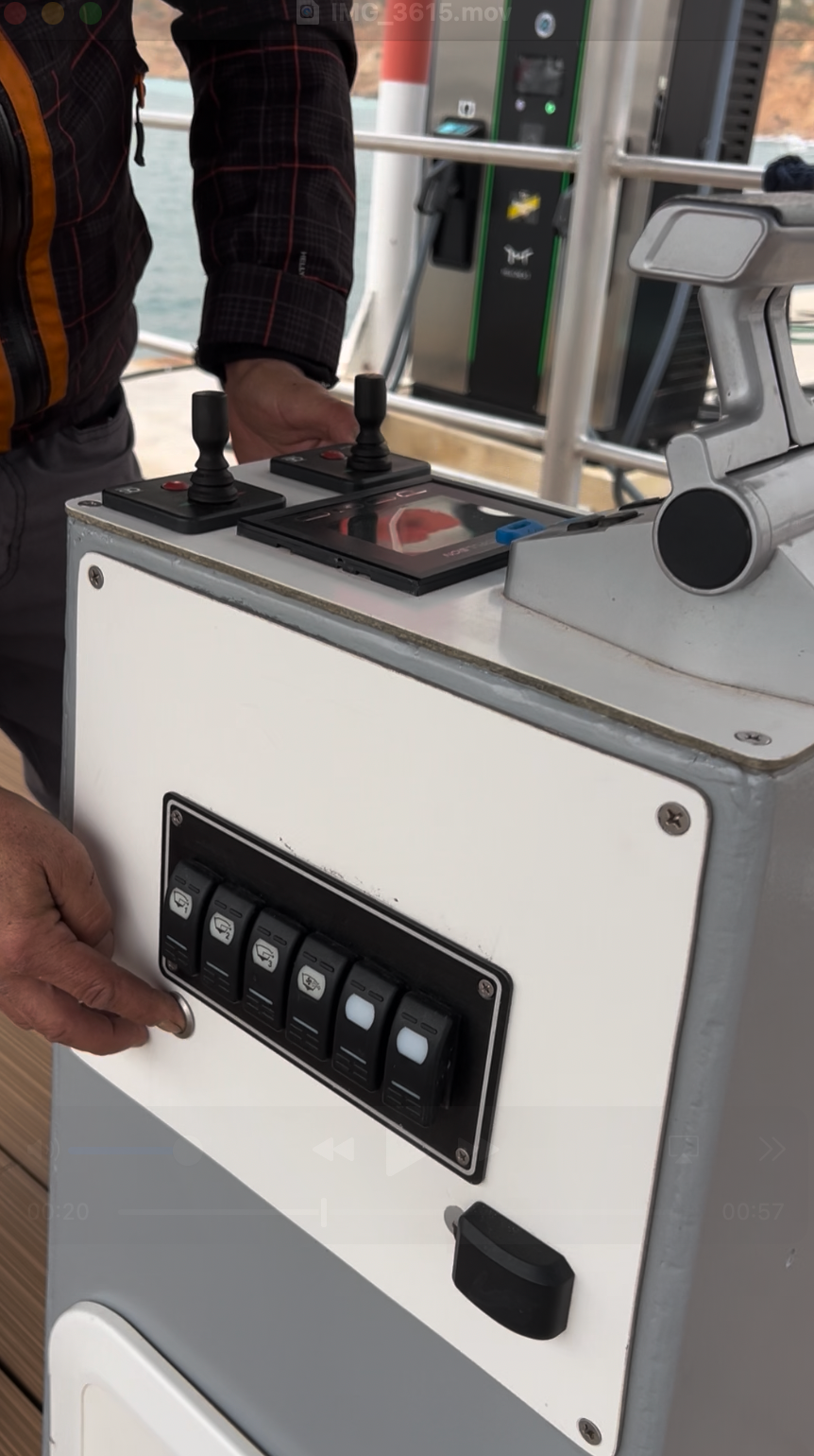 - En la consola central, a ambos lados se encuentran los botones de encendido de las baterias de propulsión. Pulsar durante 10 segundos los 2 botones para apagar ambas baterías, babor y estribor. No hace falta pulsar el mismo tiempo, son independientes.