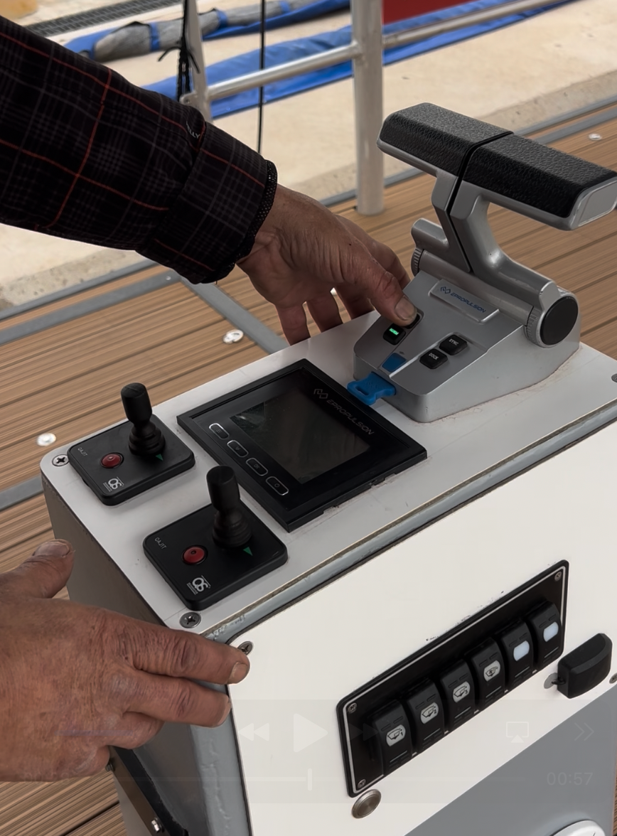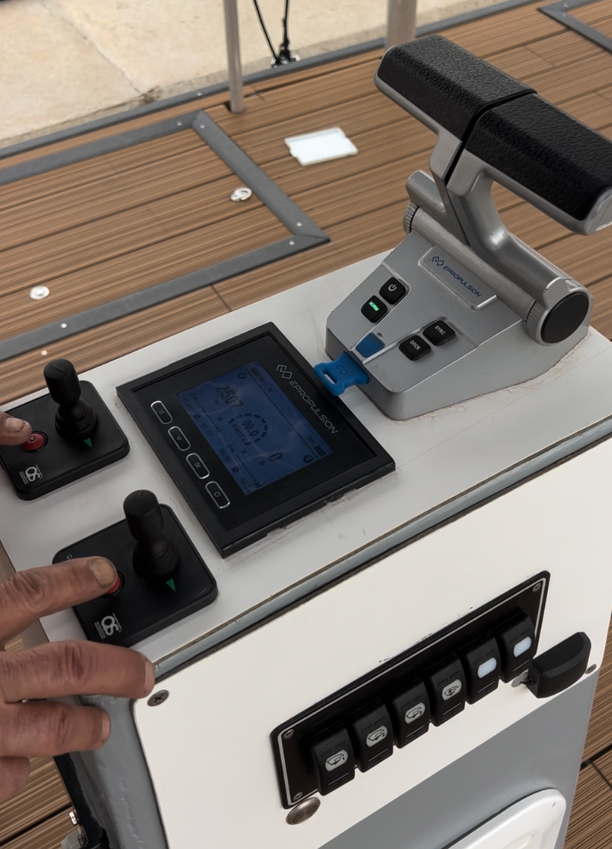 - En la consola central, a ambos lados se encuentran los botones de encendido de las baterias de propulsión. Pulsar durante 10 segundos los 2 botones para encender ambas baterías, babor y estribor. No hace falta pulsar el mismo tiempo, son independientes.